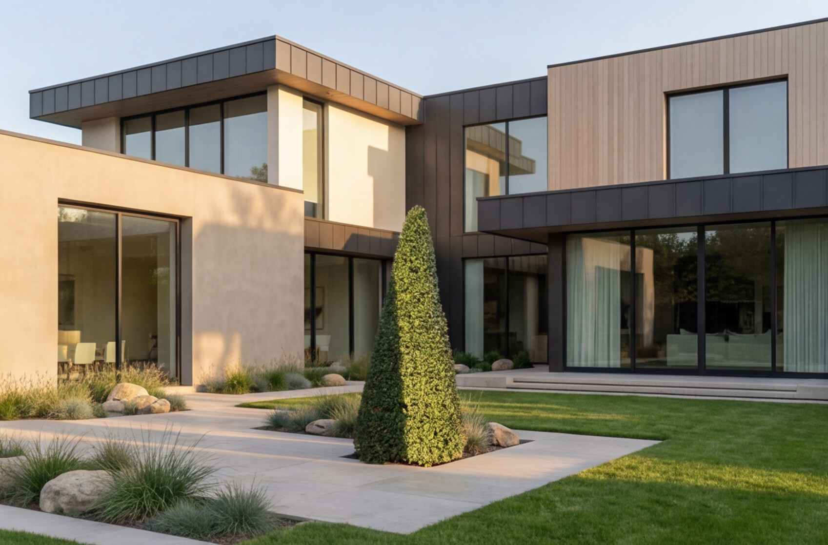 Idealiai dera minimalistinėse kompozicijose su dekoratyvinėmis žolėmis, žvyro dangomis, betoninėmis plokštėmis ar corten elementais, kur svarbus formos švarumas ir ritmas.