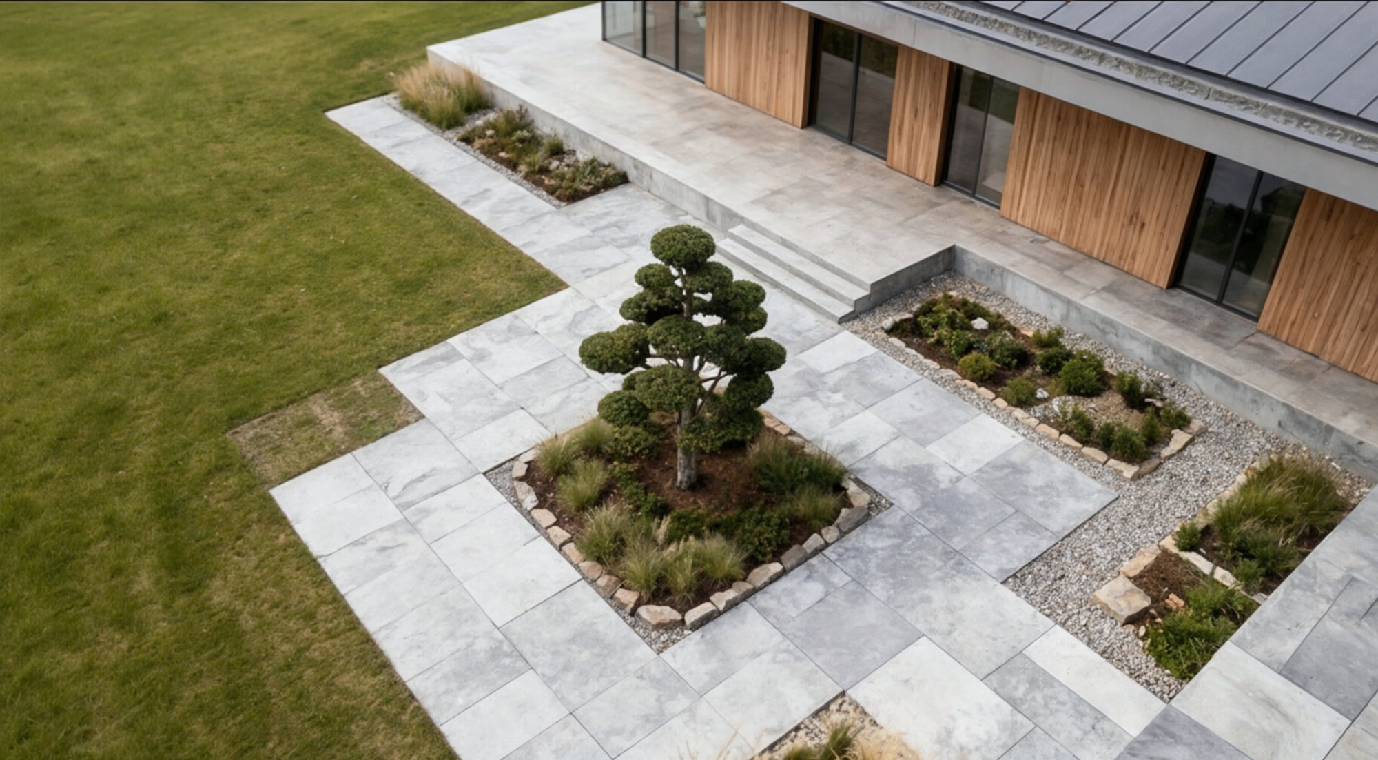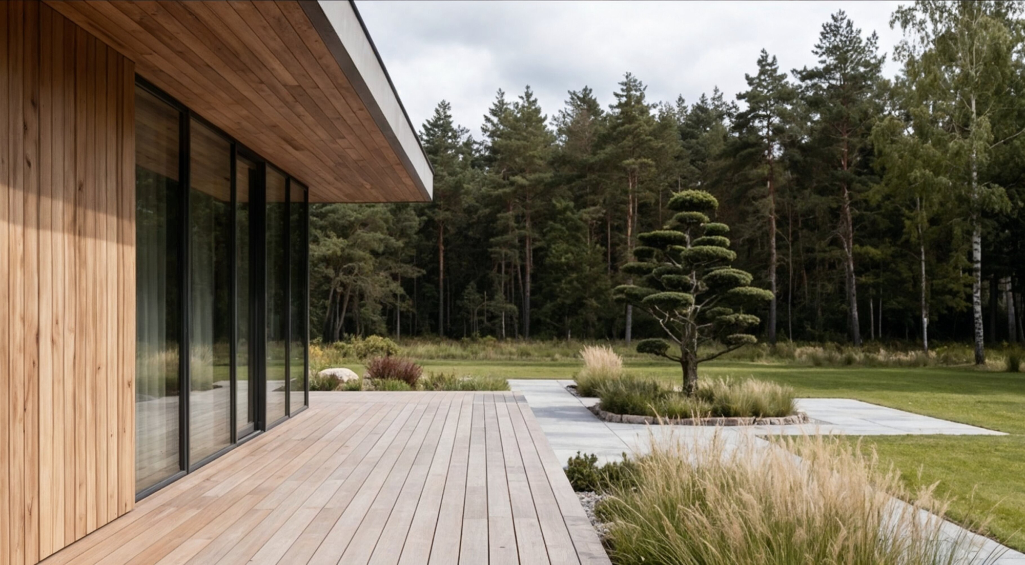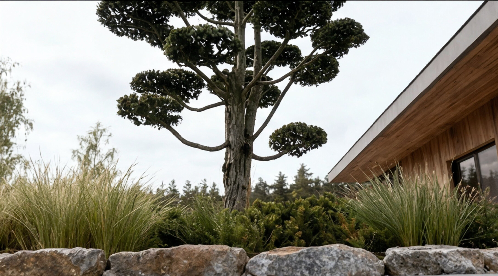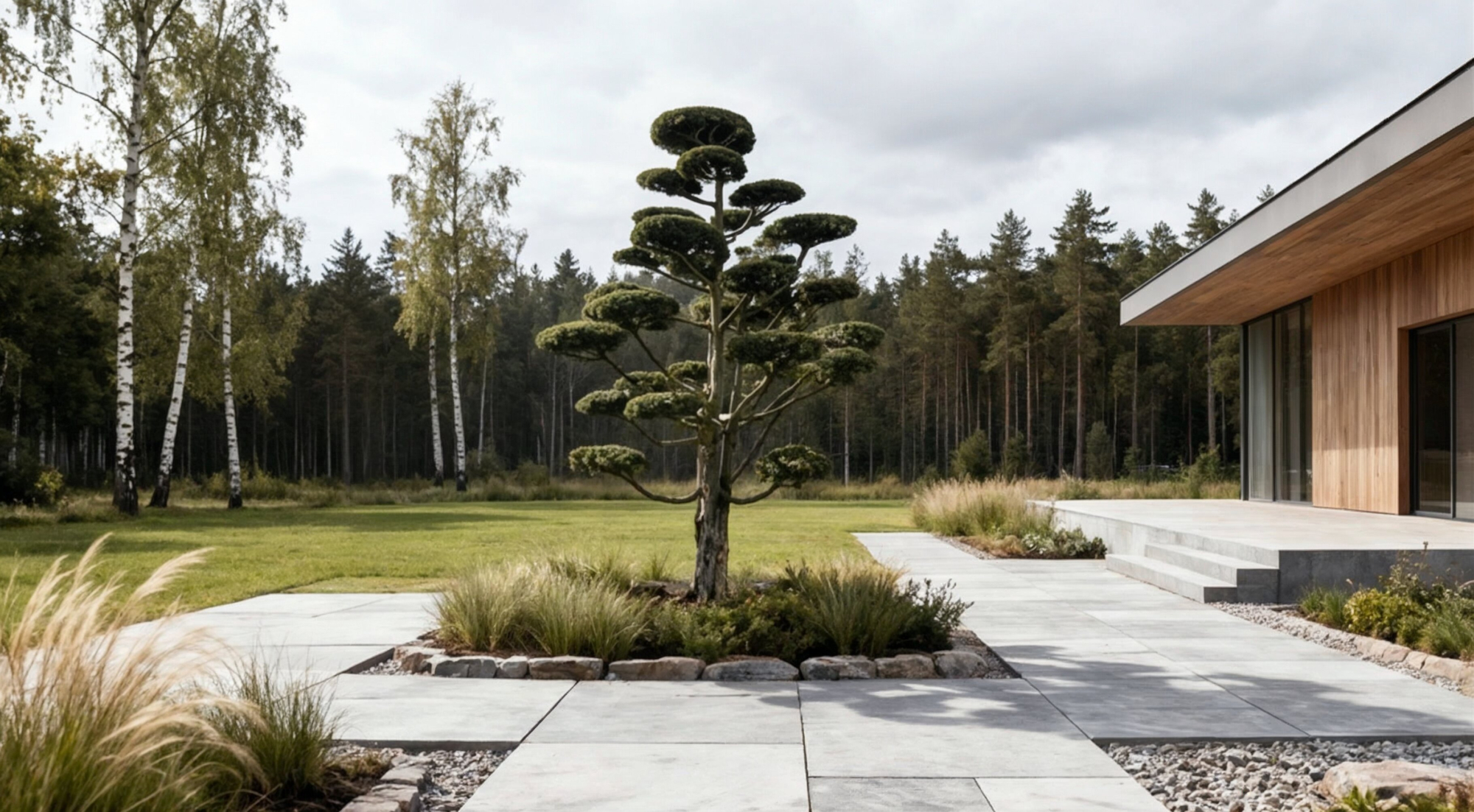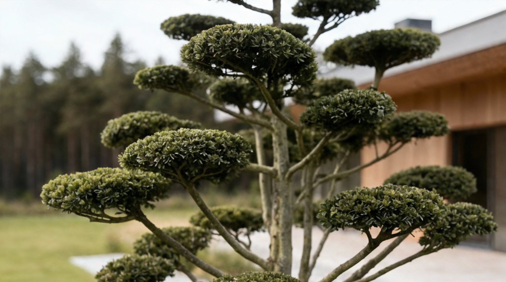 Formuotas europinio kukmedžio bonsas – subtilus architektūrinis akcentas moderniam kiemui.