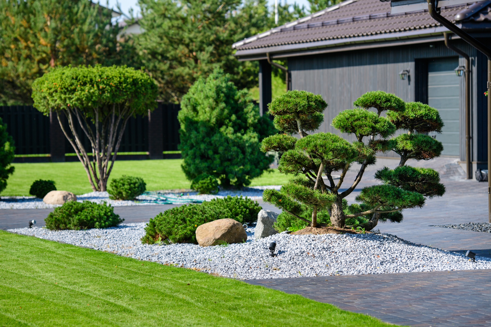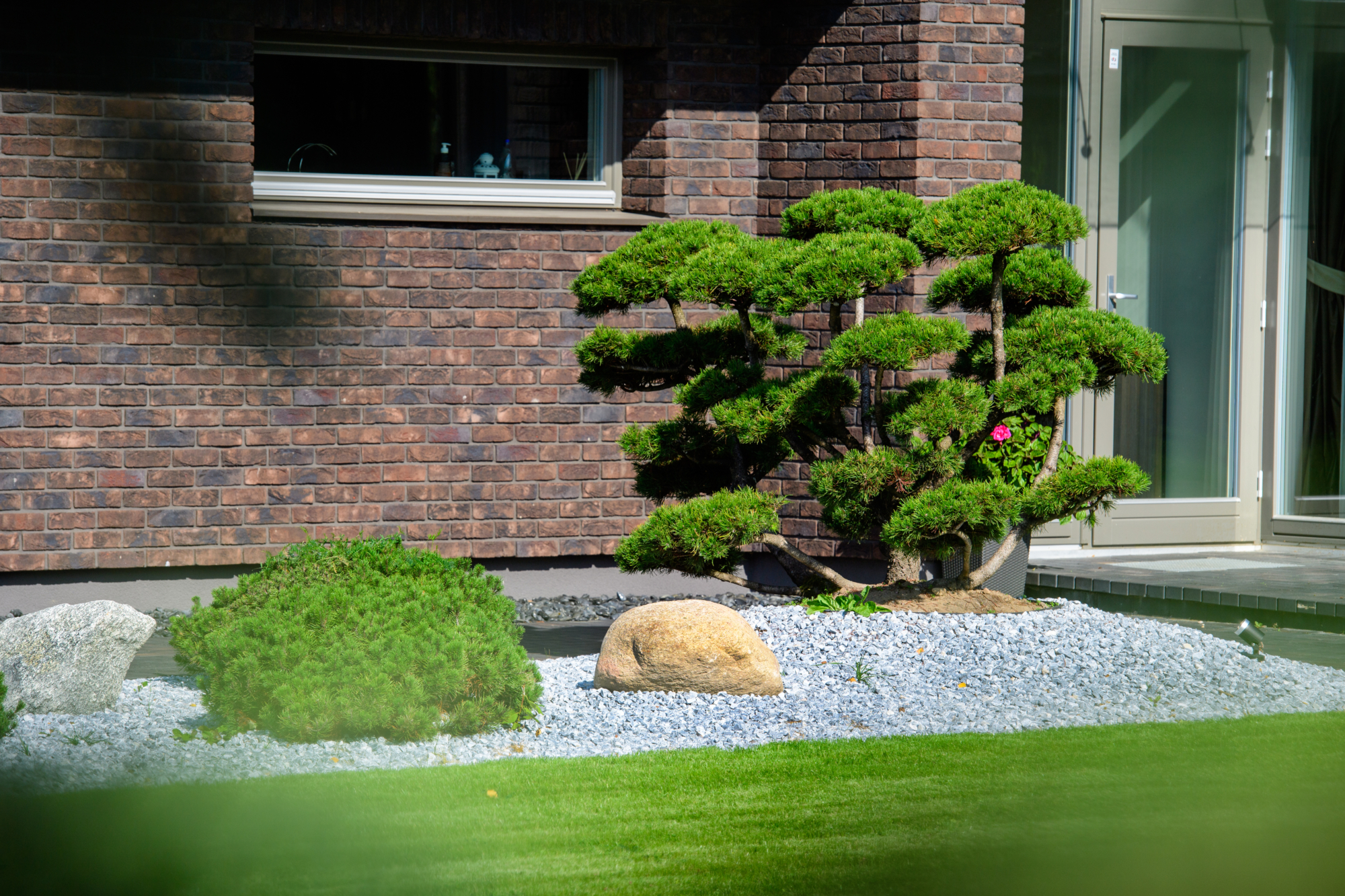 Pagrindinis akcentas – kruopščiai formuoti bonsai tipo medžiai ir krūmai, kurie sukuria vertikalų ir tekstūrinį kontrastą su žema žole ir akmeniniais elementais. Tarp augalų ir takų išdėstyti akmenukai, kurie ne tik prideda natūralumo, bet ir užtikrina lengvą priežiūrą. Projekte dominuoja švarios linijos ir tvarkingi elementai, suteikiantys aplinkai ramybės ir harmonijos jausmą.